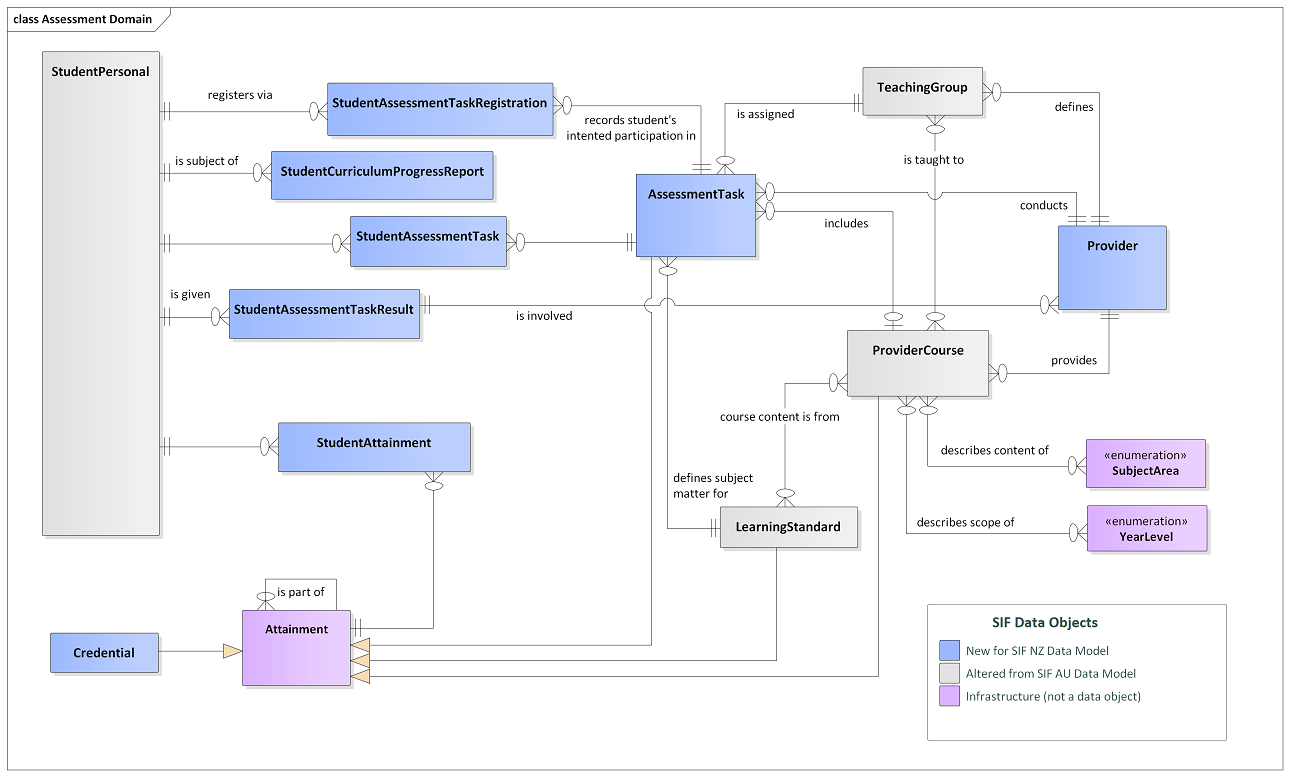 The Assessment domain describes transactional entities that record assessment of Student's learning. The domain covers everything from a simple in-class assessment task (eg grading assignment, test or essay) through to end of Course or year final marks, and curriculum progress reports as well as formal external assessments performed by external agencies (eg. NZQA, Cambridge International Education, International Baccalaureate, etc).