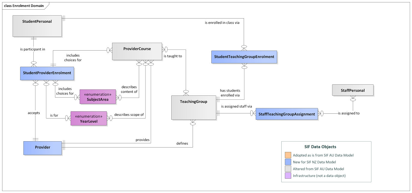 The Enrolment domain describes transactional entities whereby Students enrol at Providers, in LearningProgrammes, in Sections, or in Activities.