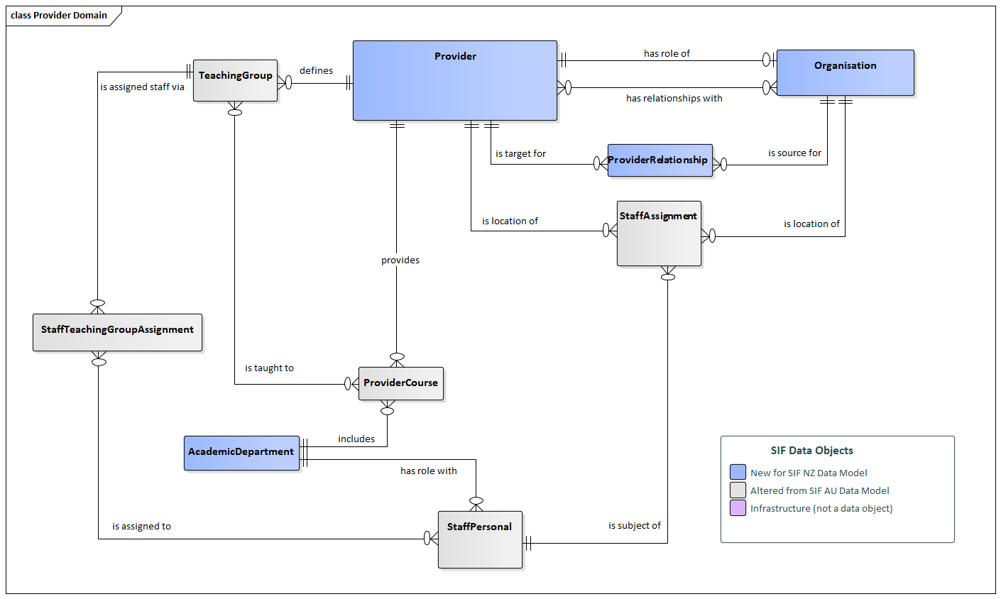 The Provider domain describes education provider entities, the relationships between them, and the Staff that work at them.