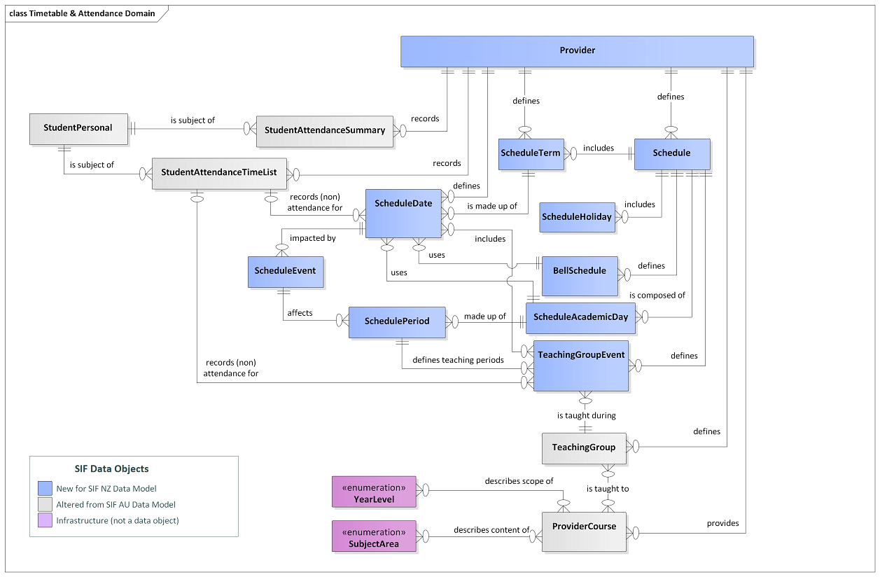 The Schedule & Attendance domain describes the school's schedule or timetable, along with transactional entities that record a Student's attendance at & absence from Providers. Attendance is recorded at either Day, Half-Day or individual Period granuality at the choice of the Provider; and reported back in summary form.